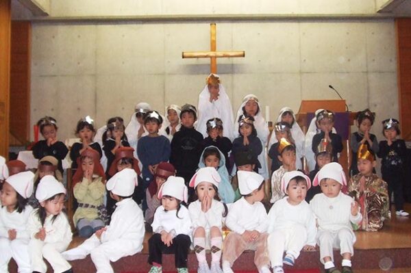 3歳児クラス(赤組)、4歳児クラス(緑組)、5歳児クラス(青組)が生活しています。3~5歳児の混合保育を行っていますので、年長児が小さい子の面倒をみています。また各担任が年齢別の製作や音楽リズムを計画的に取り入れています。一日の中で礼拝の時間を持ち、心静かにお話を聞いています。第3期保育(1~3月)になると、2歳児クラス(桃組)は、お部屋に慣れるため3,4歳児と一緒に過ごします。